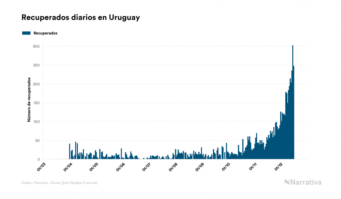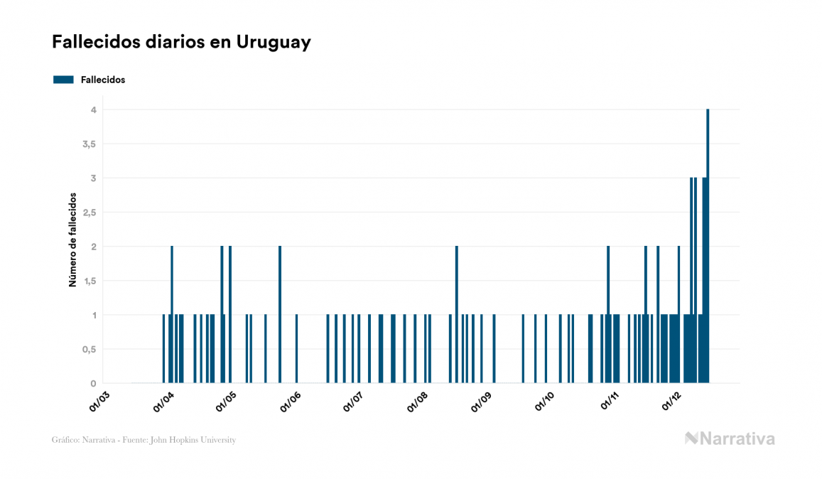 La COVID-19 deja ya 10.893 casos de contagio en Uruguay, con 3.649 de ellos actualmente activos y 102 fallecidos, según los últimos datos correspondientes al 17 de diciembre. Además, un total de 7.142 personas ya se ha recuperado desde que se produjo el primer contagio en el país.