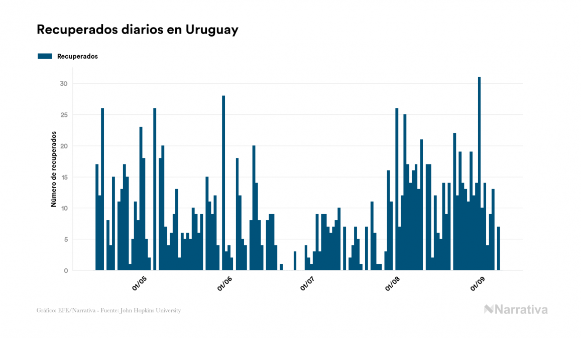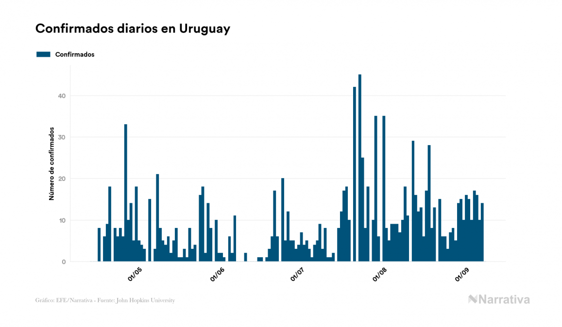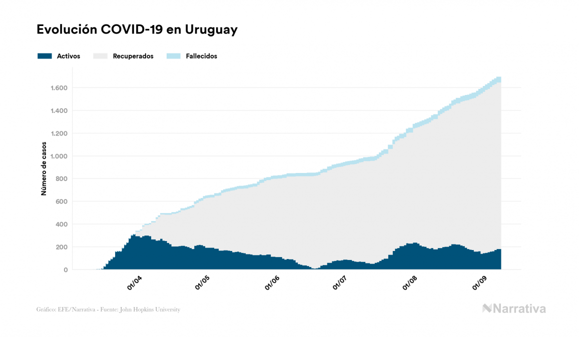 El nuevo coronavirus deja ya 1.693 casos de contagio en Uruguay, con 182 de ellos actualmente activos y 45 fallecidos, según los últimos datos correspondientes al 8 de septiembre. Además, un total de 1.466 personas ya se ha recuperado desde que se produjo el primer contagio en el país.
