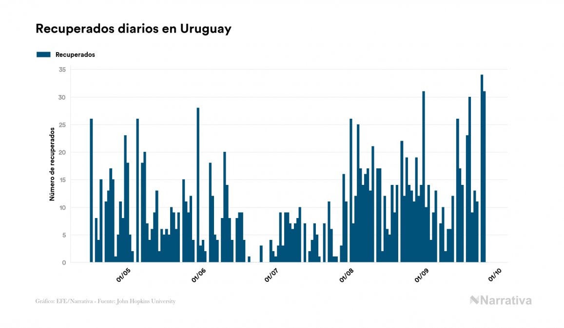 El coronavirus deja ya 1.967 casos de contagio en Uruguay, con 210 de ellos actualmente activos y 47 fallecidos, según los últimos datos correspondientes al 26 de septiembre. Además, un total de 1.710 personas ya se ha recuperado desde que se produjo el primer contagio en el país.