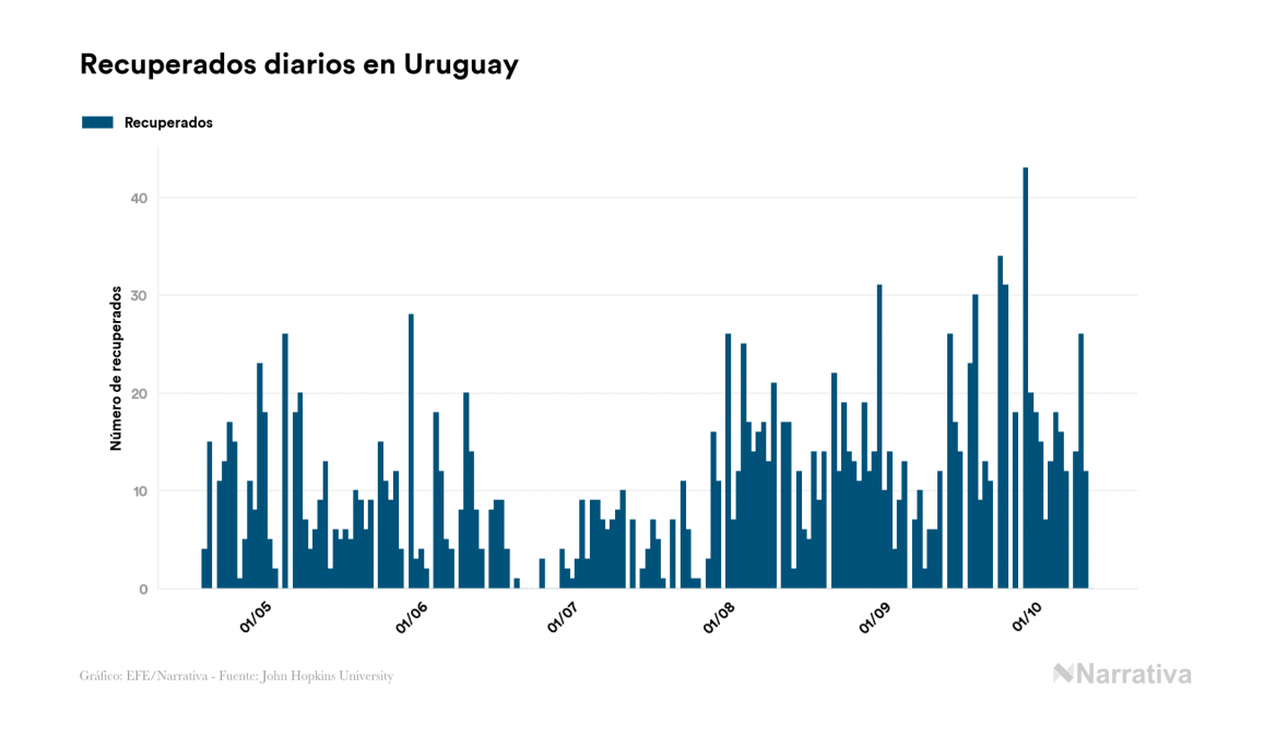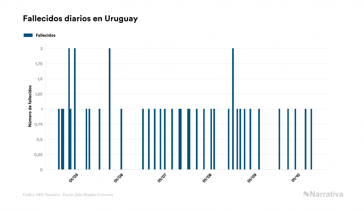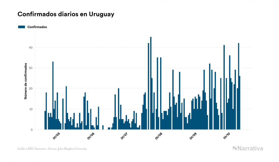El nuevo coronavirus deja ya 2.294 casos de contagio en Uruguay, con 302 de ellos actualmente activos y 50 fallecidos, según los últimos datos correspondientes al 12 de octubre. Además, un total de 1.942 personas ya se ha recuperado desde que se produjo el primer contagio en el país.