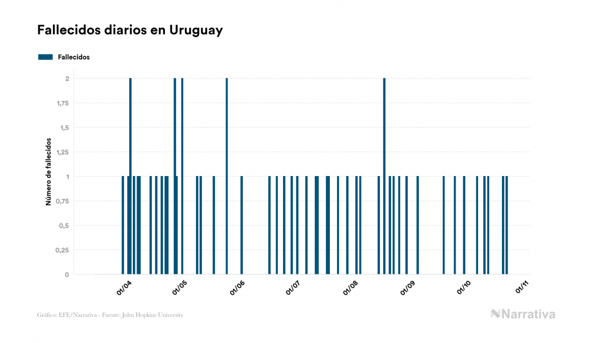 El coronavirus deja ya 2.701 casos de contagio en Uruguay, con 444 de ellos actualmente activos y 53 fallecidos, según los últimos datos correspondientes al 23 de octubre. Además, un total de 2.204 personas ya se ha recuperado desde que se produjo el primer contagio en el país.