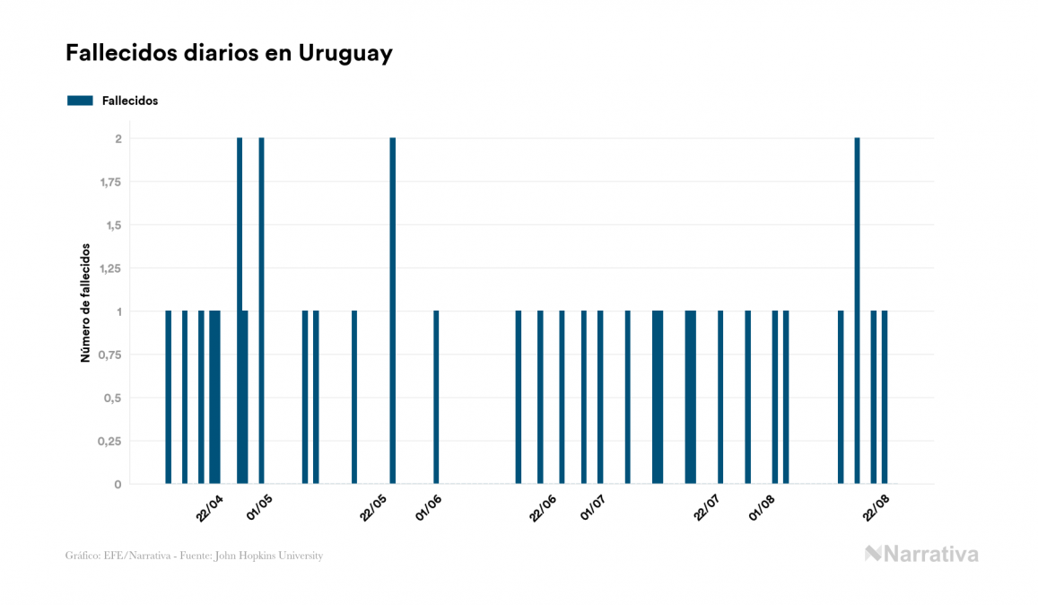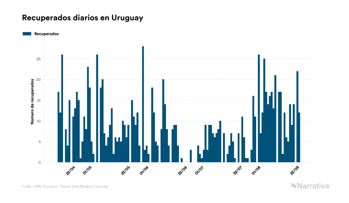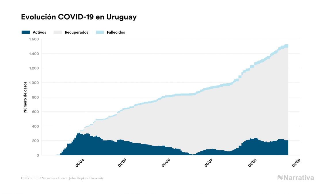 El coronavirus deja ya 1.527 casos de contagio en Uruguay, con 209 de ellos actualmente activos y 42 fallecidos, según los últimos datos correspondientes al 24 de agosto. Además, un total de 1.276 personas ya se ha recuperado desde que se produjo el primer contagio en el país.