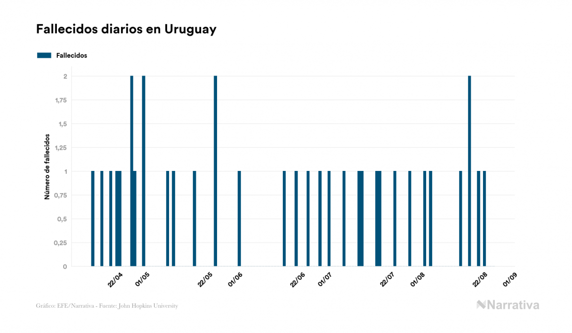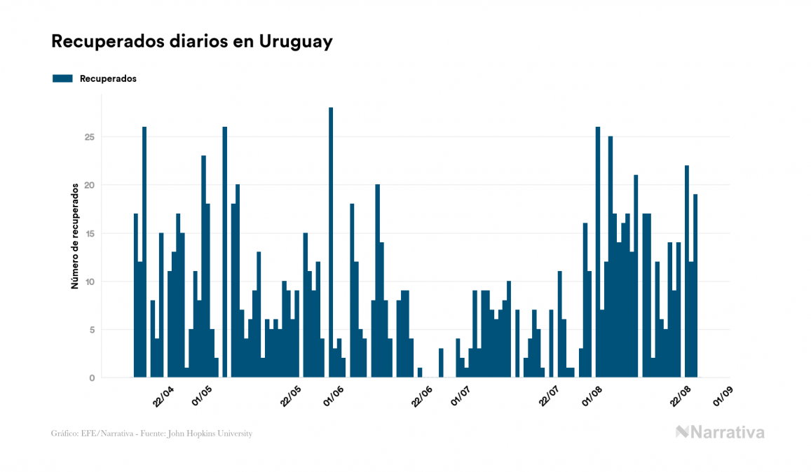 El nuevo coronavirus deja ya 1.533 casos de contagio en Uruguay, con 196 de ellos actualmente activos y 42 fallecidos, según los últimos datos correspondientes al 25 de agosto. Además, un total de 1.295 personas ya se ha recuperado desde que se produjo el primer contagio en el país.