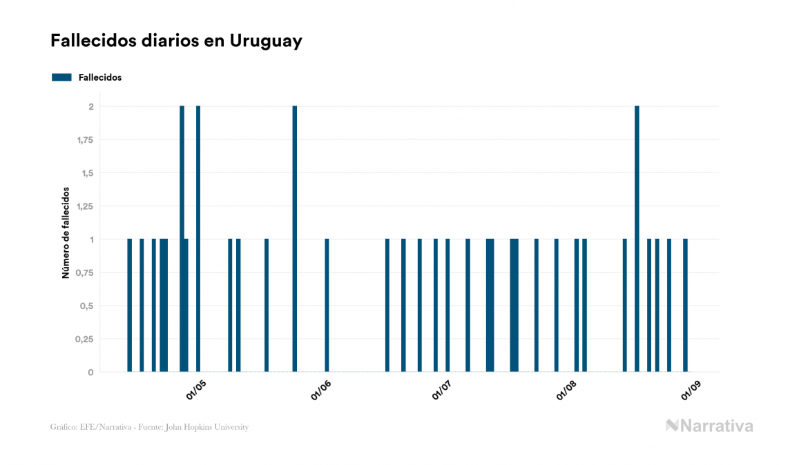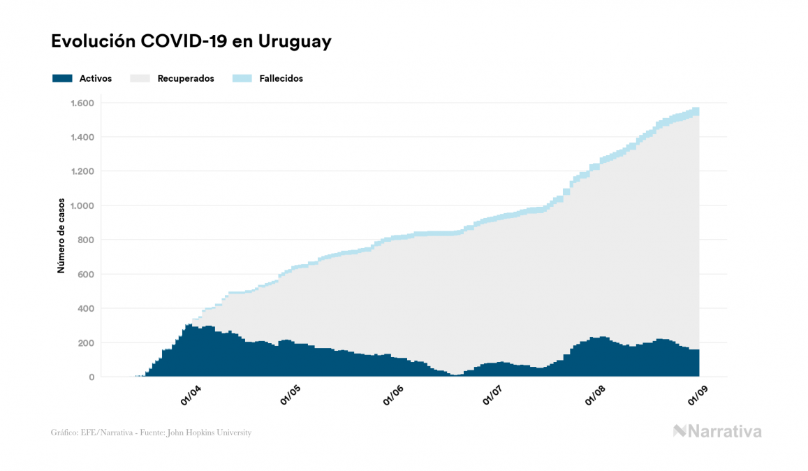 El nuevo coronavirus deja ya 1.570 casos de contagio en Uruguay, con 162 de ellos actualmente activos y 44 fallecidos, según los últimos datos correspondientes al 30 de agosto. Además, un total de 1.364 personas ya se ha recuperado desde que se produjo el primer contagio en el país.