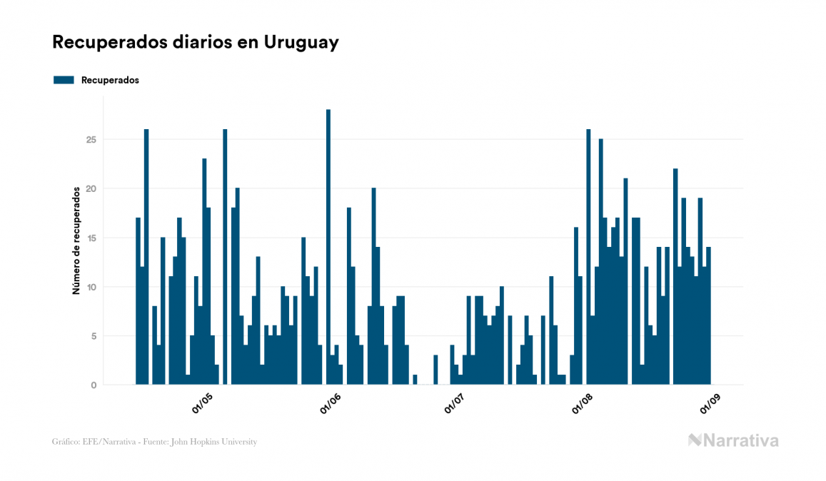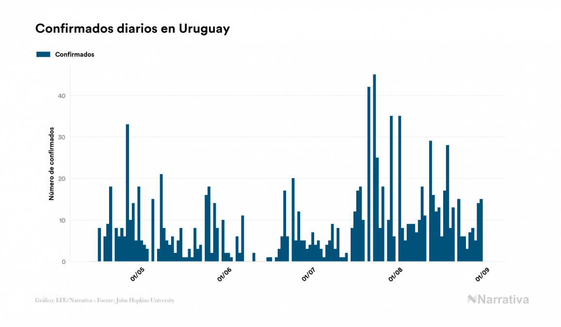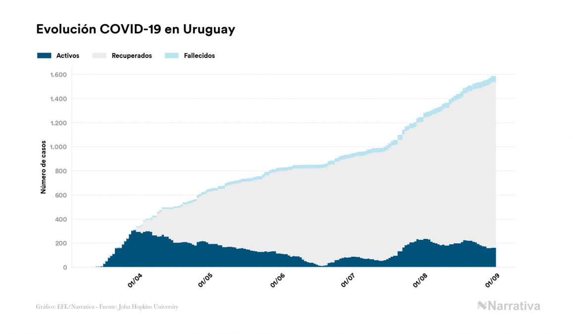 El nuevo coronavirus deja ya 1.585 casos de contagio en Uruguay, con 163 de ellos actualmente activos y 44 fallecidos, según los últimos datos correspondientes al 31 de agosto. Además, un total de 1.378 personas ya se ha recuperado desde que se produjo el primer contagio en el país.