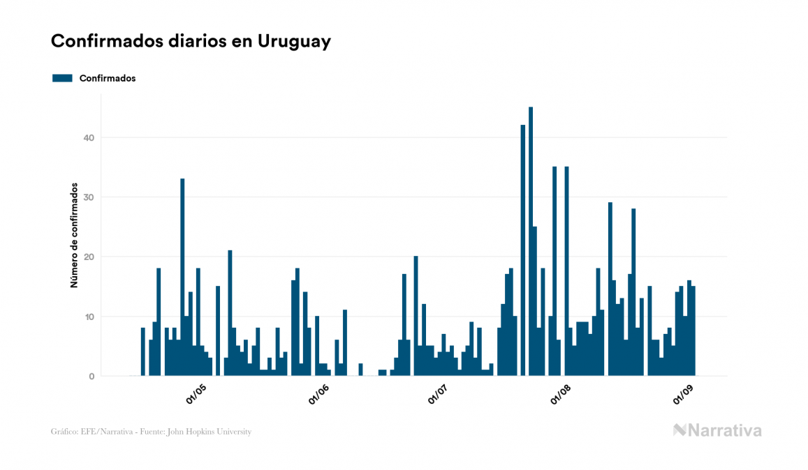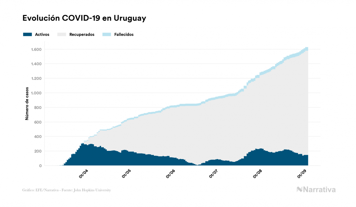 El coronavirus deja ya 1.626 casos de contagio en Uruguay, con 149 de ellos actualmente activos y 44 fallecidos, según los últimos datos correspondientes al 3 de septiembre. Además, un total de 1.433 personas ya se ha recuperado desde que se produjo el primer contagio en el país.