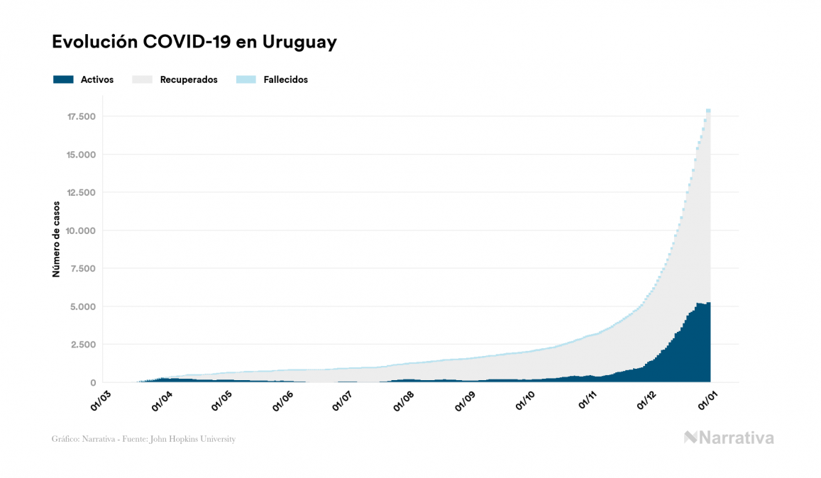 El nuevo coronavirus deja ya 17.962 casos de contagio en Uruguay, con 5.288 de ellos actualmente activos y 168 fallecidos, según los últimos datos correspondientes al 30 de diciembre. Además, un total de 12.506 personas ya se ha recuperado desde que se produjo el primer contagio en el país.