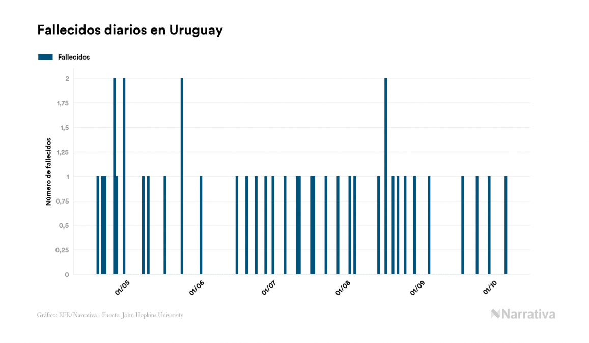 El nuevo coronavirus deja ya 2.177 casos de contagio en Uruguay, con 250 de ellos actualmente activos y 49 fallecidos, según los últimos datos correspondientes al 7 de octubre. Además, un total de 1.878 personas ya se ha recuperado desde que se produjo el primer contagio en el país.