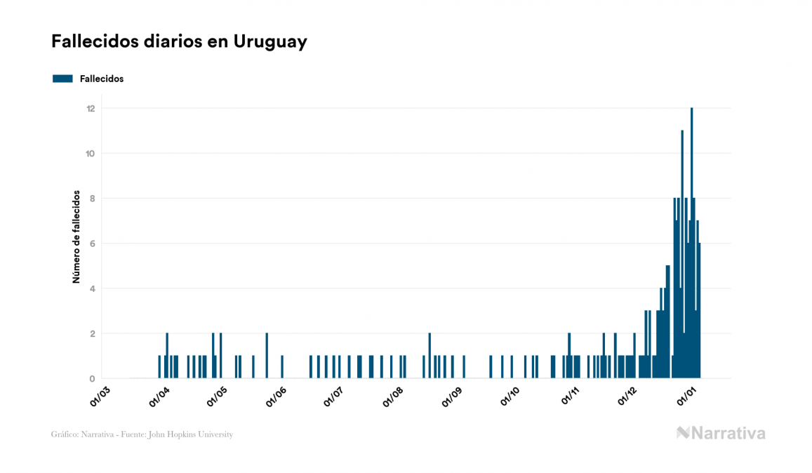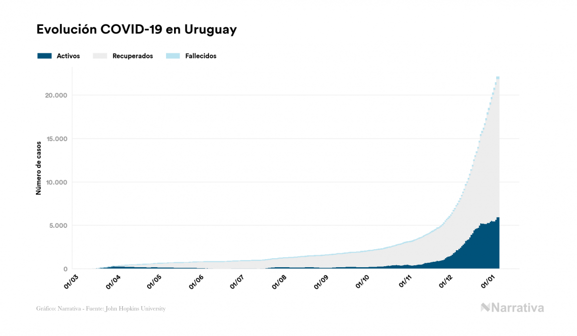 El coronavirus deja ya 22.104 casos de contagio en Uruguay, con 5.968 de ellos actualmente activos y 217 fallecidos, según los últimos datos correspondientes al 6 de enero. Además, un total de 15.919 personas ya se ha recuperado desde que se produjo el primer contagio en el país.