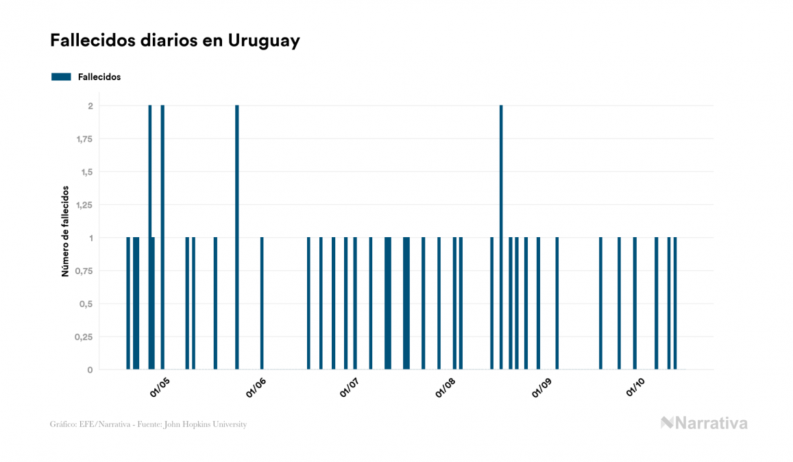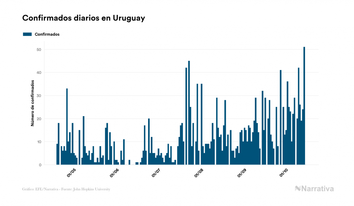 El coronavirus deja ya 2.388 casos de contagio en Uruguay, con 330 de ellos actualmente activos y 51 fallecidos, según los últimos datos correspondientes al 15 de octubre. Además, un total de 2.007 personas ya se ha recuperado desde que se produjo el primer contagio en el país.
