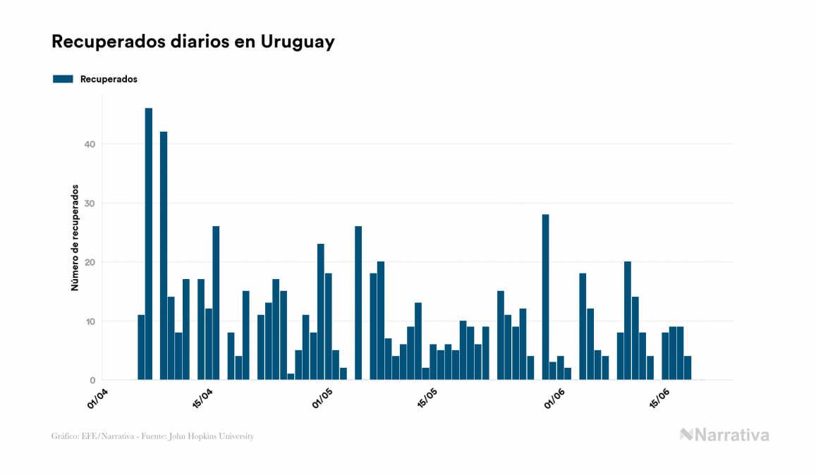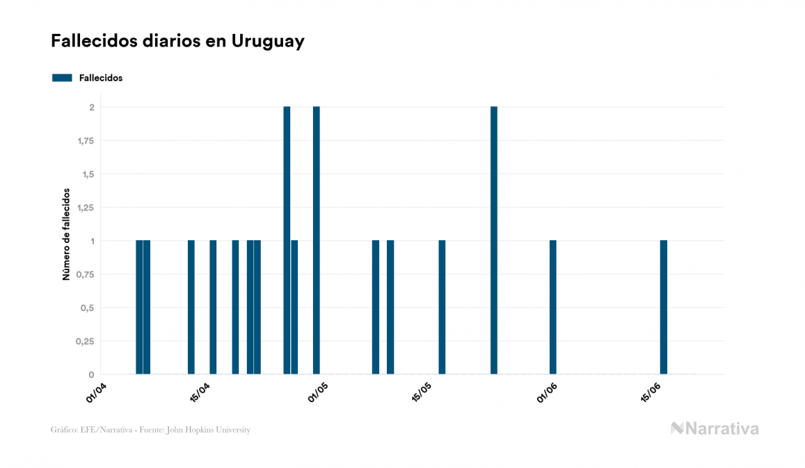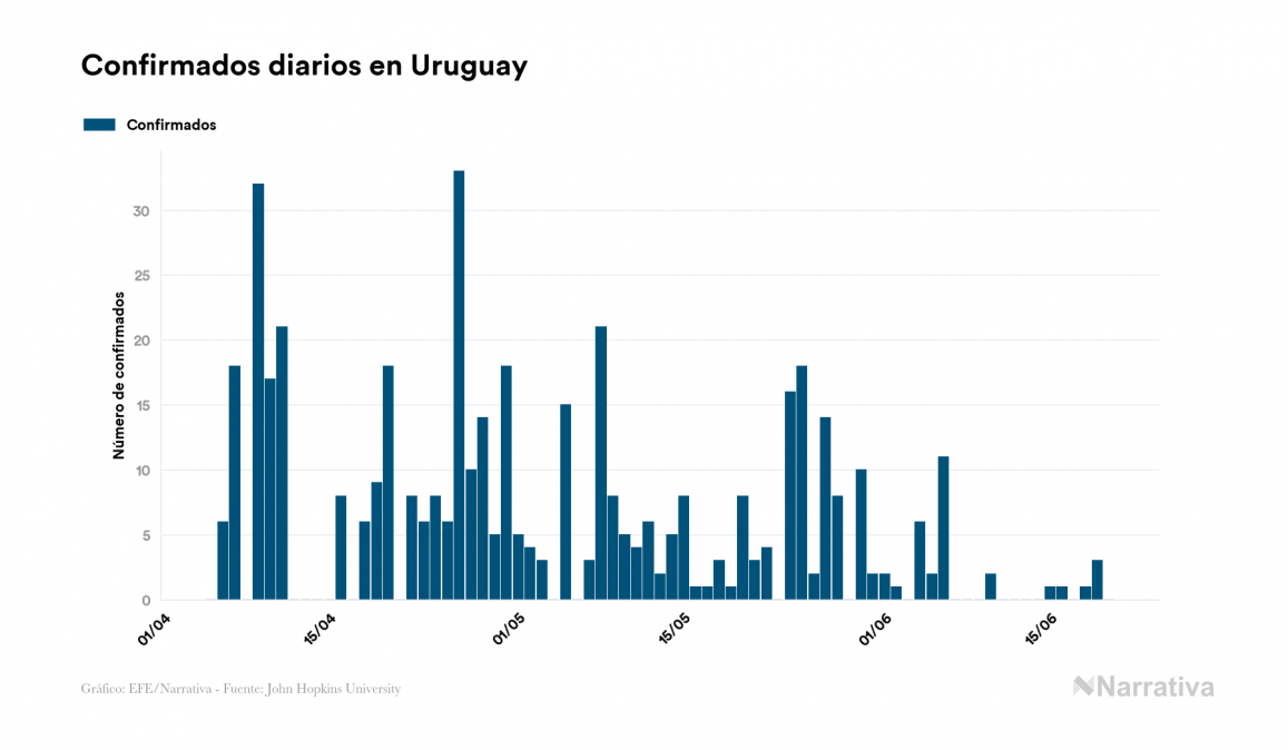 La COVID-19 deja ya 853 casos de contagio en Uruguay, con 15 de ellos actualmente activos y 24 fallecidos, según los últimos datos correspondientes al 20 de junio. Además, un total de 814 personas ya se ha recuperado desde que se produjo el primer contagio en el país.