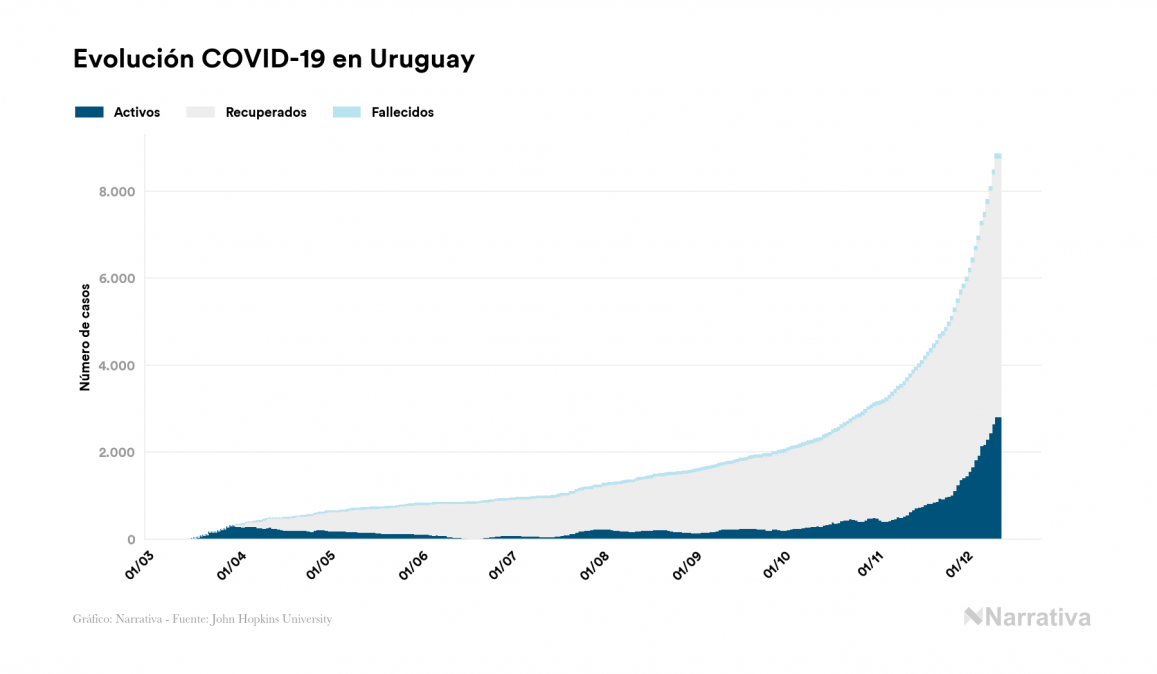 El nuevo coronavirus deja ya 8.849 casos de contagio en Uruguay, con 2.818 de ellos actualmente activos y 90 fallecidos, según los últimos datos correspondientes al 12 de diciembre. Además, un total de 5.941 personas ya se ha recuperado desde que se produjo el primer contagio en el país.