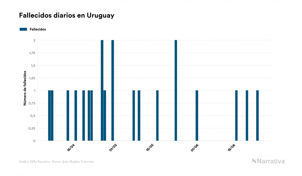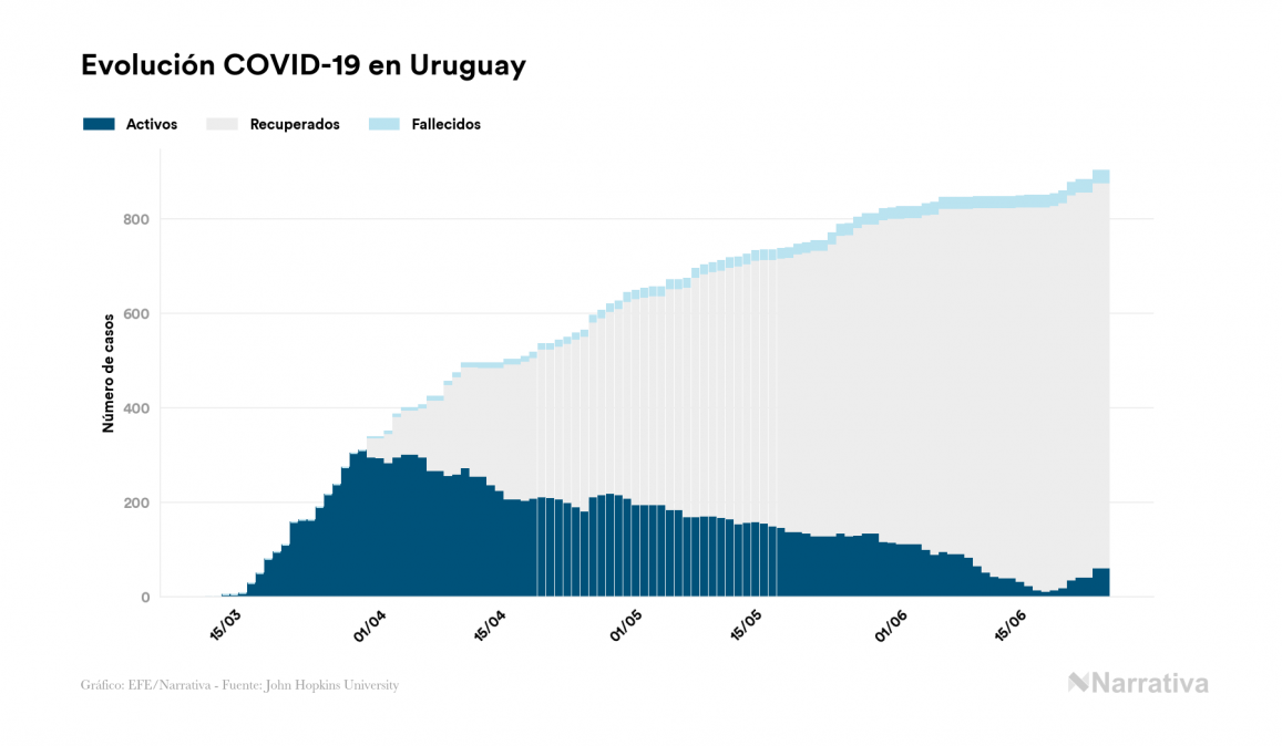 La COVID-19 deja ya 902 casos de contagio en Uruguay, con 61 de ellos actualmente activos y 26 fallecidos, según los últimos datos correspondientes al 25 de junio. Además, un total de 815 personas ya se ha recuperado desde que se produjo el primer contagio en el país.