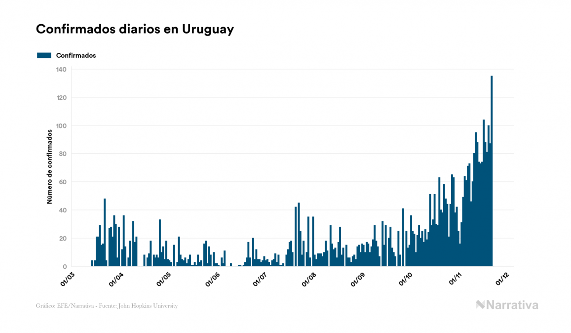 El nuevo coronavirus deja ya 4.699 casos de contagio en Uruguay, con 949 de ellos actualmente activos y 71 fallecidos, según los últimos datos correspondientes al 23 de noviembre. Además, un total de 3.679 personas ya se ha recuperado desde que se produjo el primer contagio en el país.