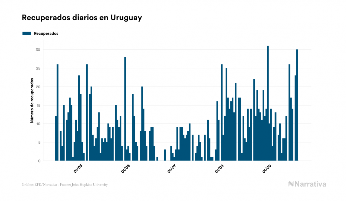 El nuevo coronavirus deja ya 1.904 casos de contagio en Uruguay, con 246 de ellos actualmente activos y 46 fallecidos, según los últimos datos correspondientes al 20 de septiembre. Además, un total de 1.612 personas ya se ha recuperado desde que se produjo el primer contagio en el país.