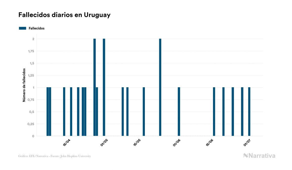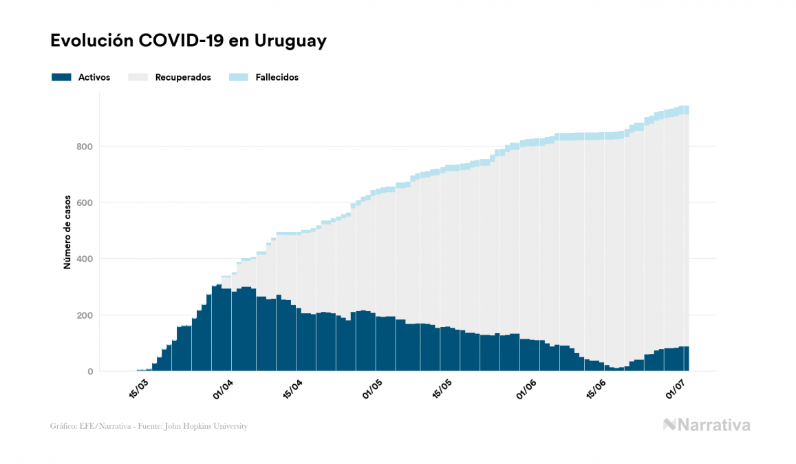 La COVID-19 deja ya 943 casos de contagio en Uruguay, con 90 de ellos actualmente activos y 28 fallecidos, según los últimos datos correspondientes al 2 de julio. Además, un total de 825 personas ya se ha recuperado desde que se produjo el primer contagio en el país.