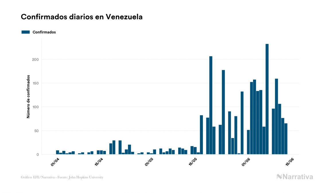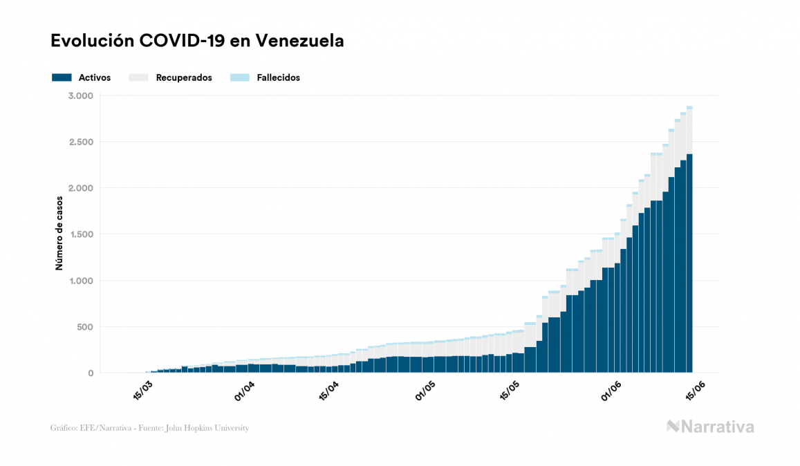 Según los últimos datos, Venezuela continúa con 2.369 casos activos de COVID-19 tras confirmarse 65 nuevos positivos este sábado. Desde el comienzo de la pandemia, la cifra total de contagiados asciende a 2.879, con 487 recuperados y 23 fallecidos.
