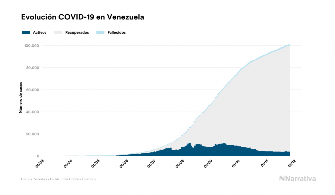 El nuevo coronavirus deja ya 100.817 casos de contagio en Venezuela, con 4.268 de ellos actualmente activos y 880 fallecidos, según los últimos datos correspondientes al 26 de noviembre. Además, un total de 95.669 personas ya se ha recuperado desde que se produjo el primer contagio en el país.