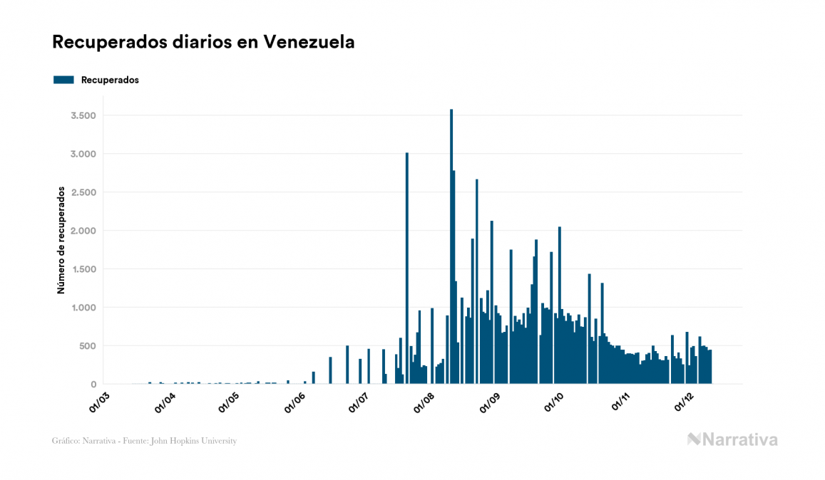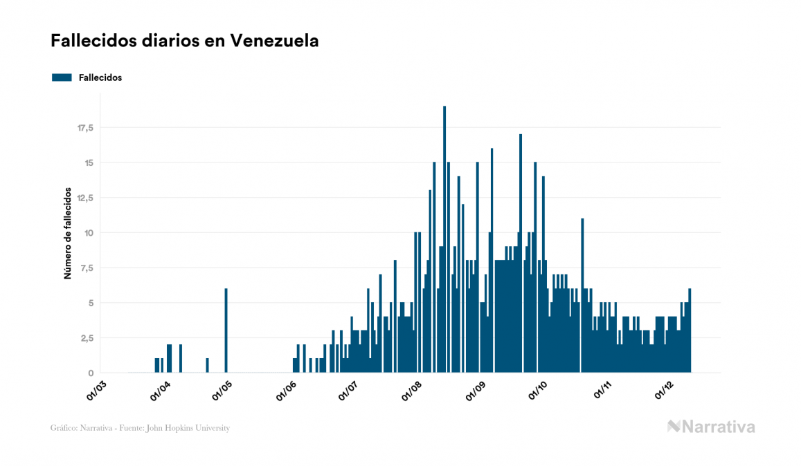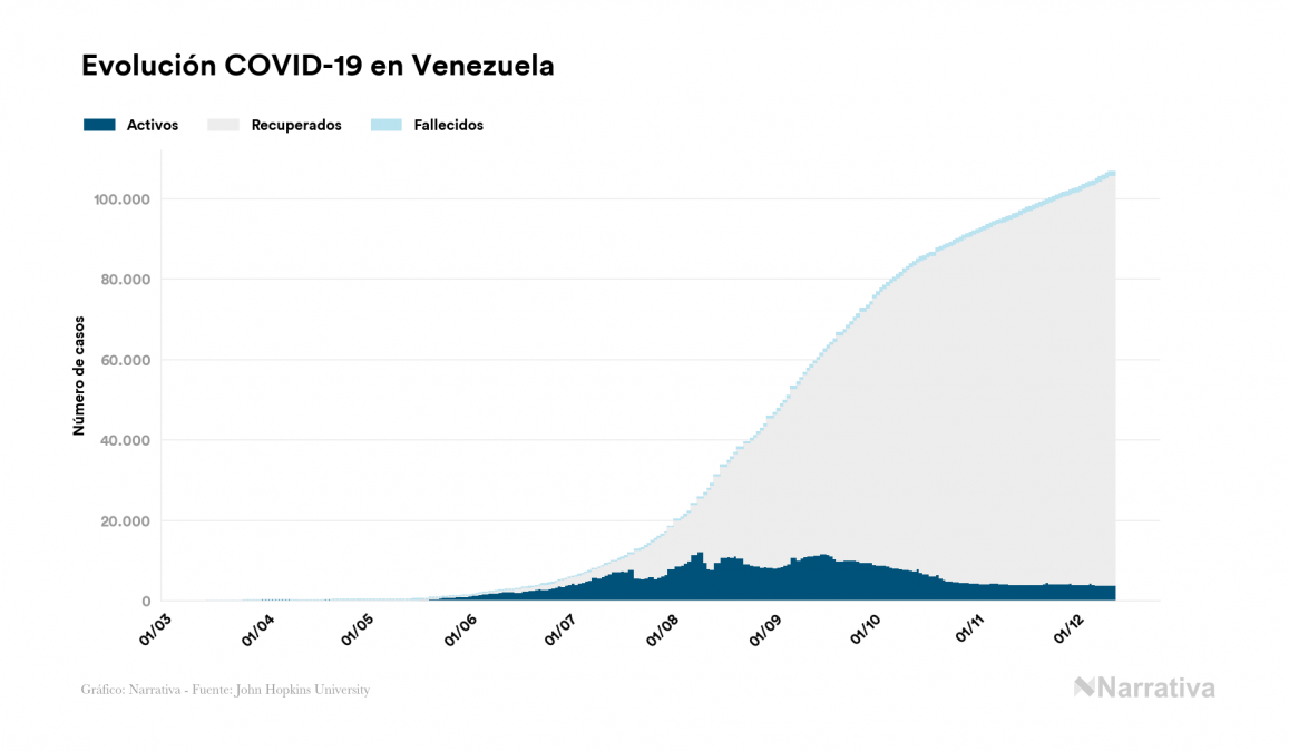La COVID-19 deja ya 106.715 casos de contagio en Venezuela, con 3.948 de ellos actualmente activos y 944 fallecidos, según los últimos datos correspondientes al 12 de diciembre. Además, un total de 101.823 personas ya se ha recuperado desde que se produjo el primer contagio en el país.