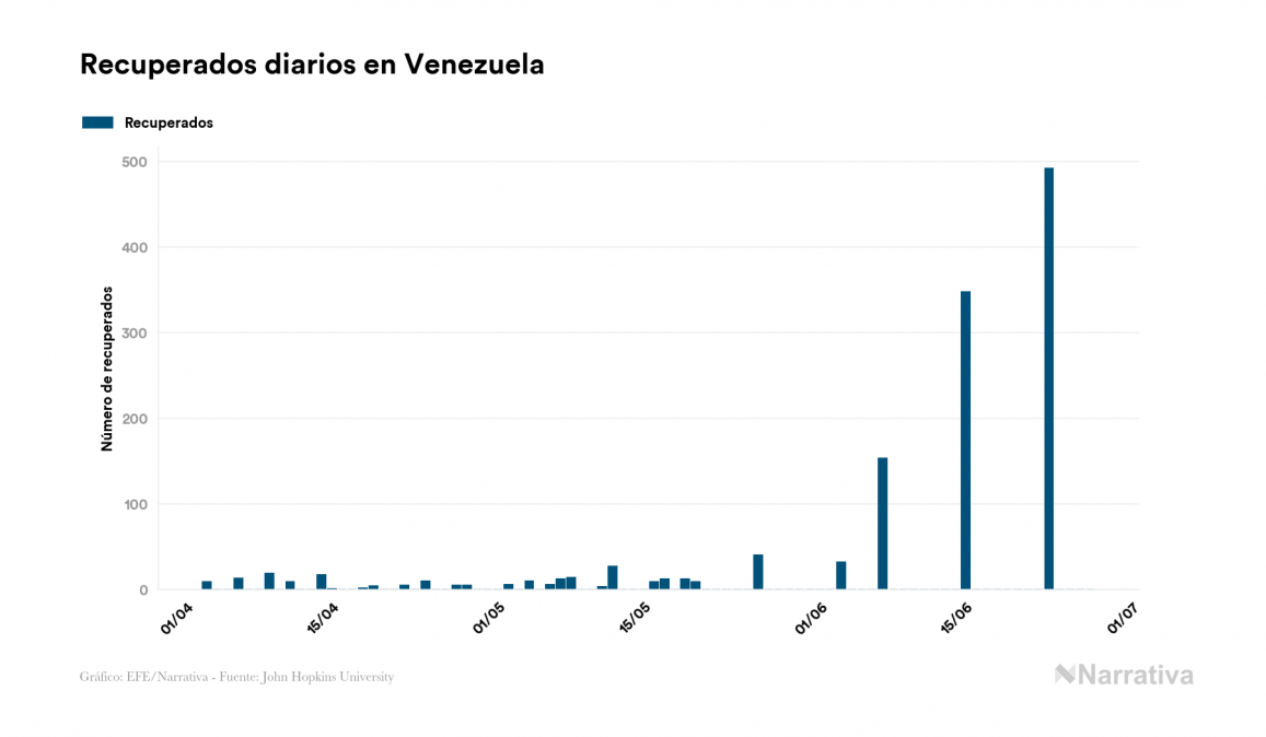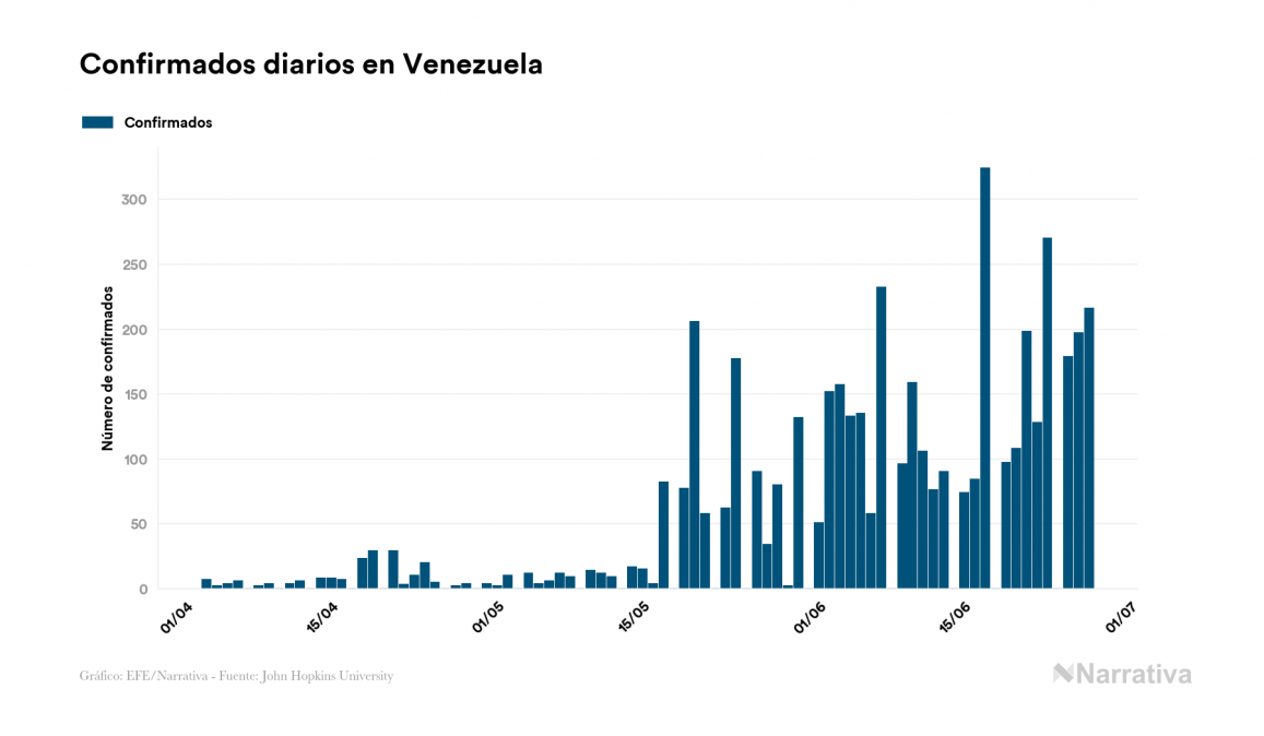 La COVID-19 deja ya 4.779 casos de contagio en Venezuela, con 3.411 de ellos actualmente activos, 41 fallecidos y 216 nuevos positivos, según los últimos datos correspondientes al 27 de junio. Además, desde el primer caso se han recuperado 1.327 personas.