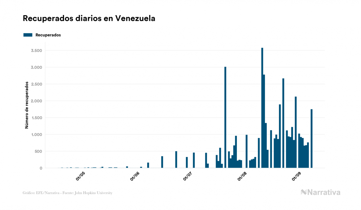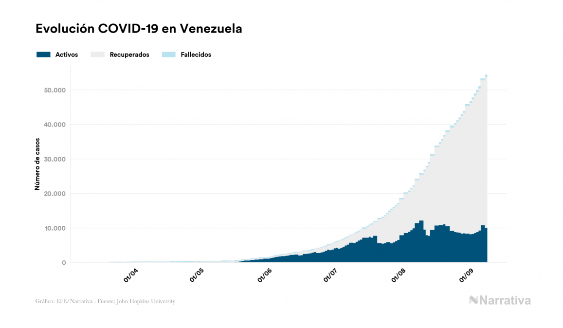 Según los últimos datos, actualmente en Venezuela hay 10.161 casos activos de COVID-19 tras confirmarse 1.061 nuevos positivos y 1.747 altas médicas este martes. Desde el comienzo de la pandemia, la cifra total de contagiados asciende a 54.350, con 43.753 recuperados y 436 fallecidos.