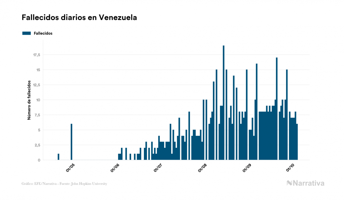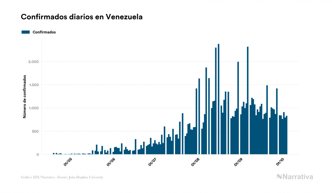 Según los últimos datos, actualmente en Venezuela hay 8.899 casos activos de COVID-19 tras confirmarse 826 nuevos positivos y 882 altas médicas este domingo. Desde el comienzo de la pandemia, el número total de contagiados asciende a 77.646, con 68.098 recuperados y 649 fallecidos.