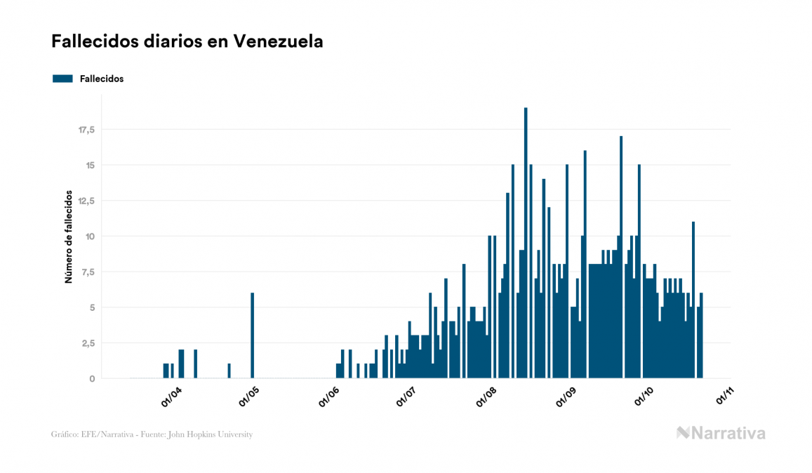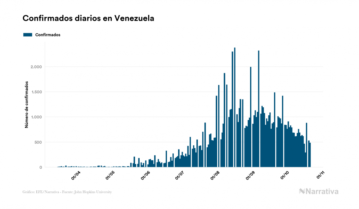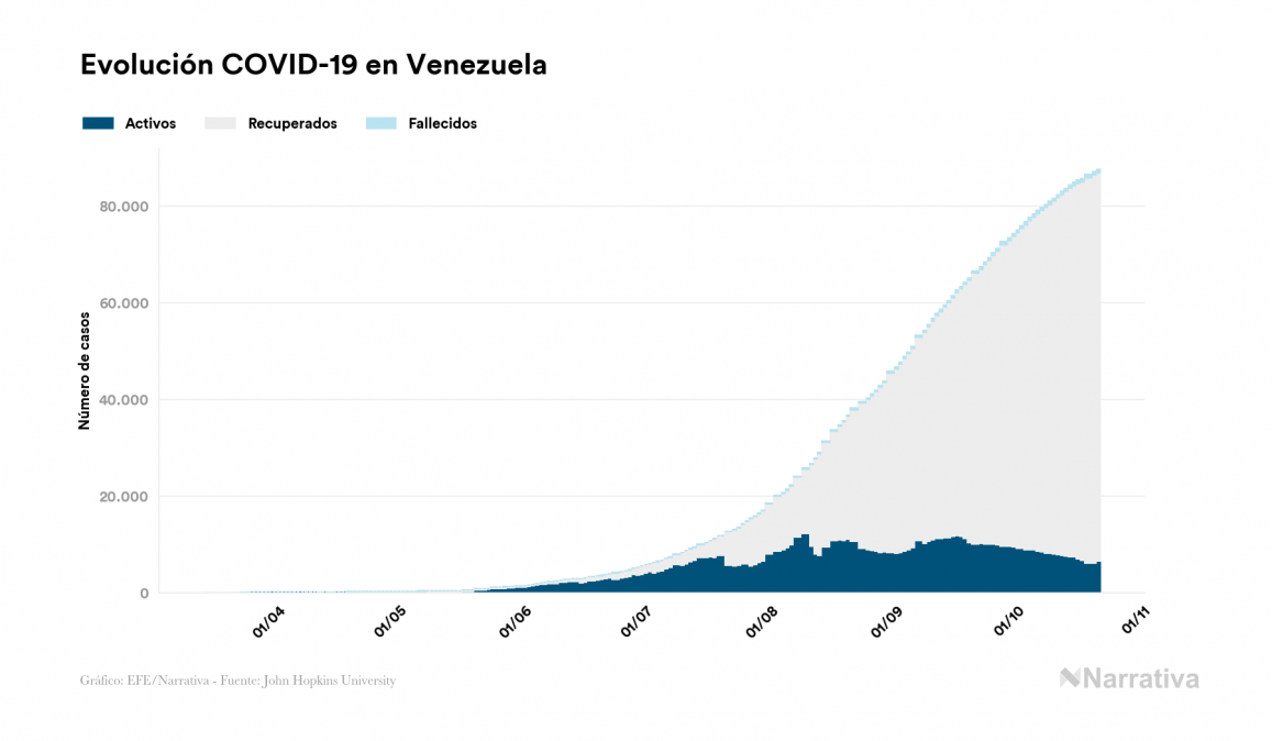 El coronavirus deja ya 87.644 casos de contagio en Venezuela, con 6.581 de ellos actualmente activos, 747 fallecidos y 483 nuevos positivos, según los últimos datos correspondientes al 21 de octubre. Además, desde el primer positivo se han recuperado 80.316 personas.