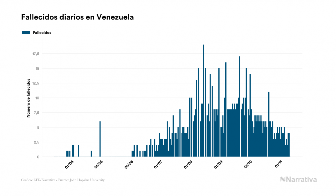 El nuevo coronavirus deja ya 95.445 casos de contagio en Venezuela, con 4.252 de ellos actualmente activos y 834 fallecidos, según los últimos datos correspondientes al 11 de noviembre. Además, un total de 90.359 personas ya se ha recuperado desde que se produjo el primer contagio en el país.