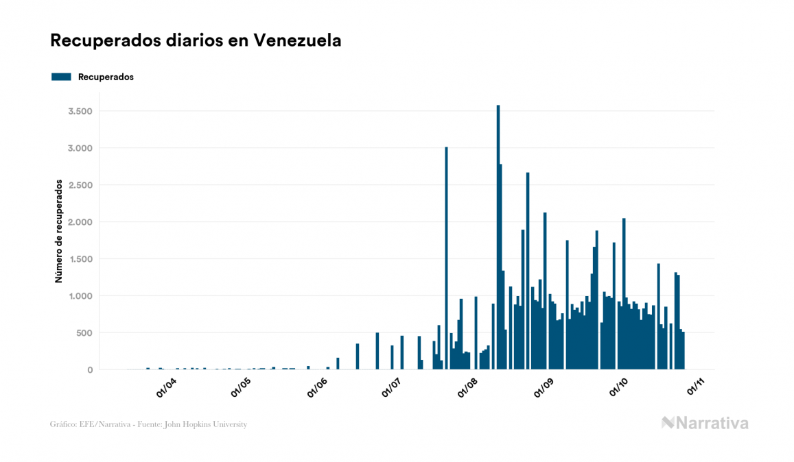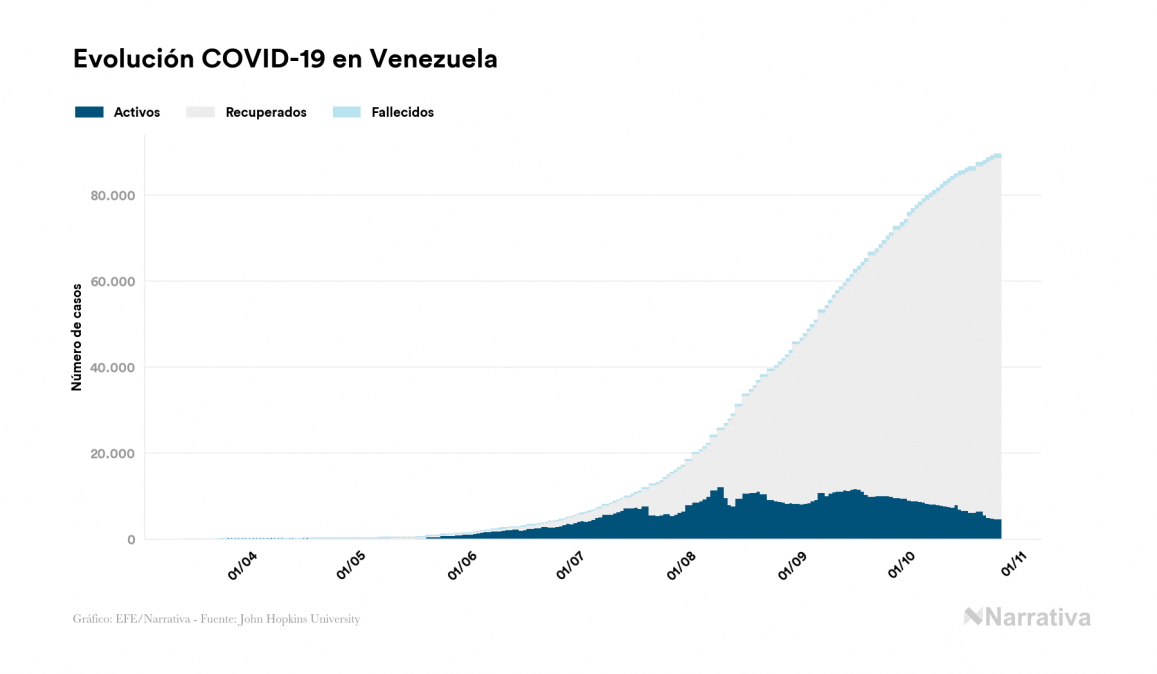 El nuevo coronavirus deja ya 89.565 casos de contagio en Venezuela, con 4.845 de ellos actualmente activos y 773 fallecidos, según los últimos datos correspondientes al 26 de octubre. Además, un total de 83.947 personas ya se ha recuperado desde que se produjo el primer contagio en el país.