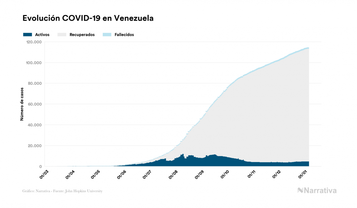 El nuevo coronavirus deja ya 114.407 casos de contagio en Venezuela, con 4.901 de ellos actualmente activos y 1.038 fallecidos, según los últimos datos correspondientes al 5 de enero. Además, un total de 108.468 personas ya se ha recuperado desde que se produjo el primer contagio en el país.