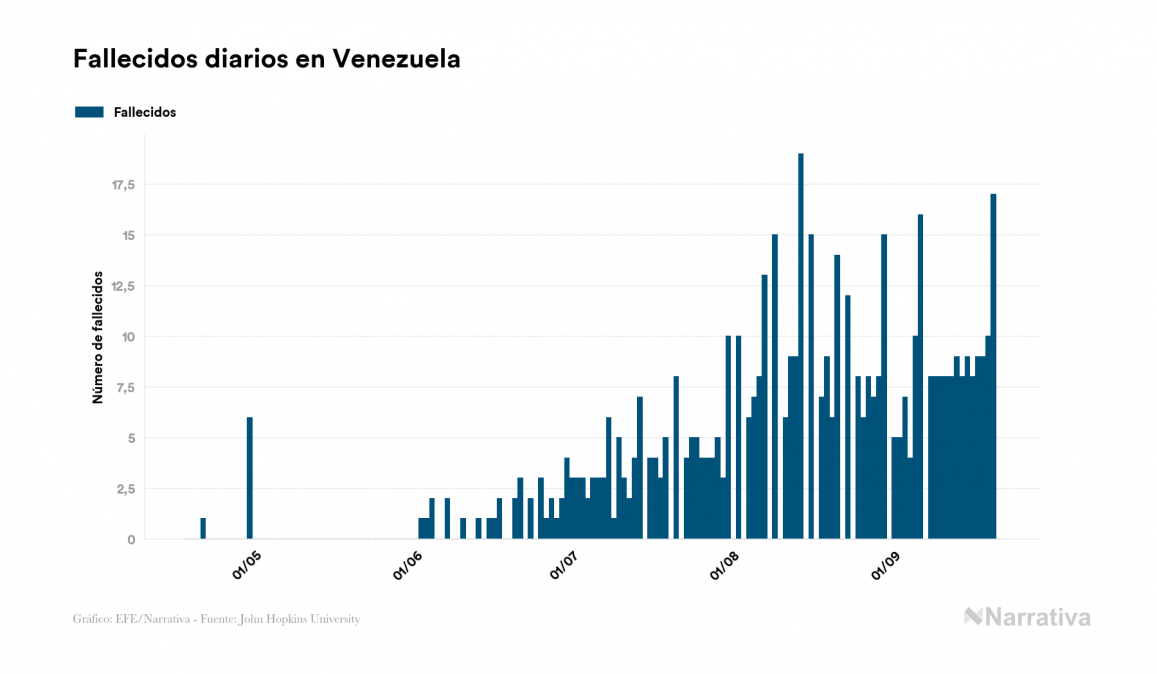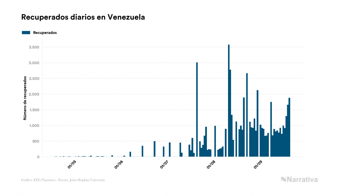 El nuevo coronavirus deja ya 66.656 casos de contagio en Venezuela, con 10.013 de ellos actualmente activos y 547 fallecidos, según los últimos datos correspondientes al 21 de septiembre. Además, un total de 56.096 personas ya se ha recuperado desde que se produjo el primer contagio en el país.