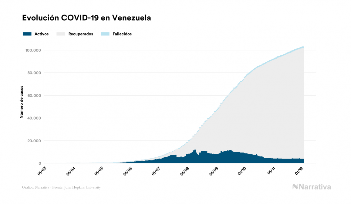 El coronavirus deja ya 103.067 casos de contagio en Venezuela, con 4.132 de ellos actualmente activos y 905 fallecidos, según los últimos datos correspondientes al 3 de diciembre. Además, un total de 98.030 personas ya se ha recuperado desde que se produjo el primer contagio en el país.