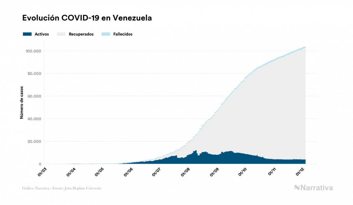 El coronavirus deja ya 103.548 casos de contagio en Venezuela, con 4.118 de ellos actualmente activos y 909 fallecidos, según los últimos datos correspondientes al 4 de diciembre. Además, un total de 98.521 personas ya se ha recuperado desde que se produjo el primer contagio en el país.