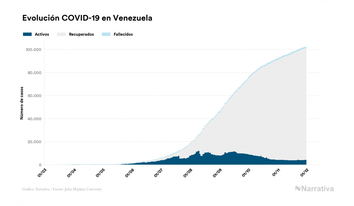 El coronavirus deja ya 102.040 casos de contagio en Venezuela, con 4.494 de ellos actualmente activos y 894 fallecidos, según los últimos datos correspondientes al 30 de noviembre. Además, un total de 96.652 personas ya se ha recuperado desde que se produjo el primer contagio en el país.