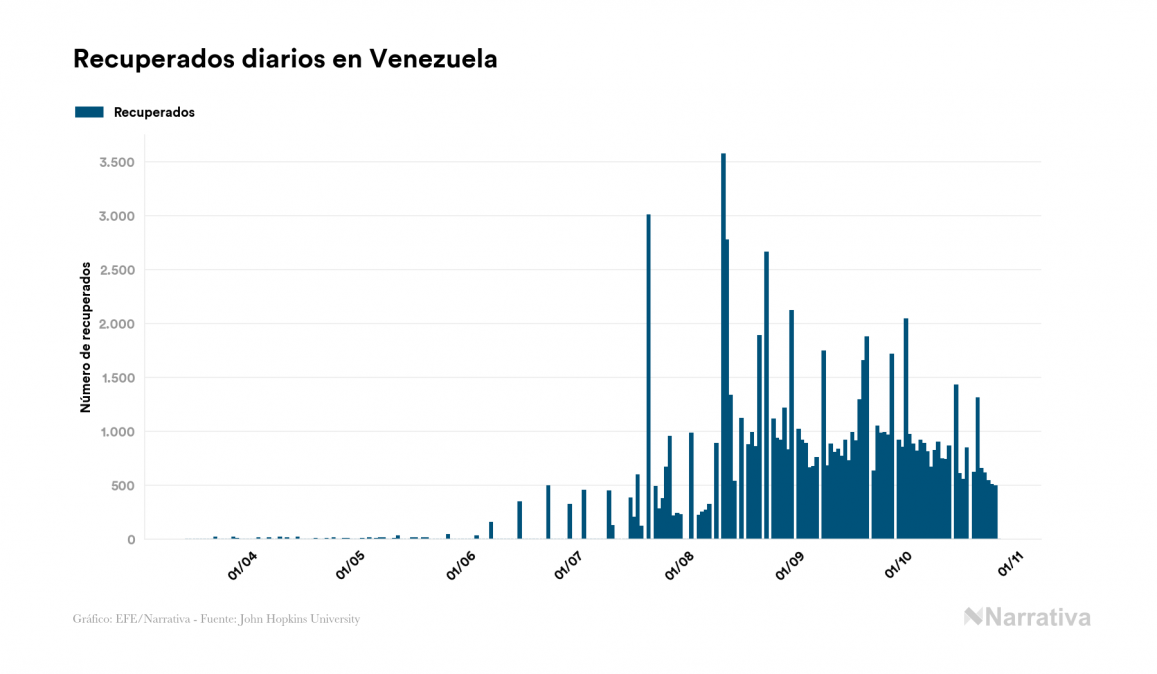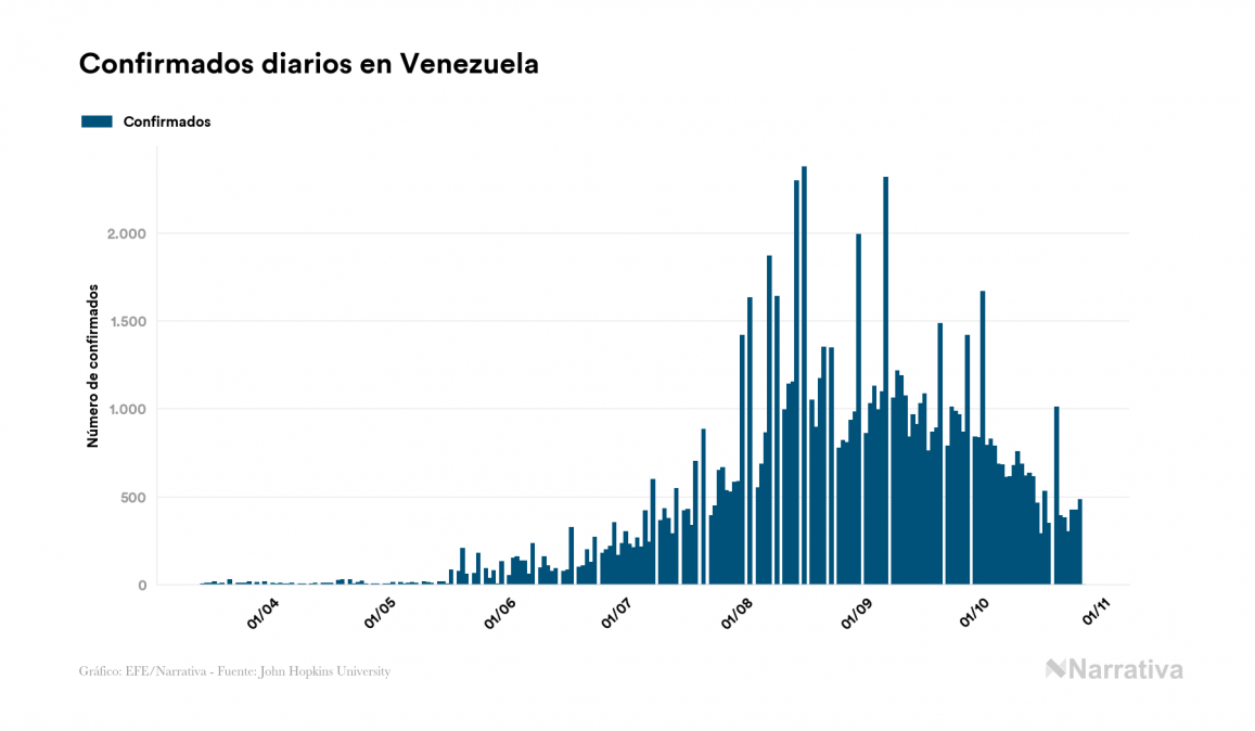 El coronavirus deja ya 90.047 casos de contagio en Venezuela, con 4.826 de ellos actualmente activos y 777 fallecidos, según los últimos datos correspondientes al 27 de octubre. Además, un total de 84.444 personas ya se ha recuperado desde que se produjo el primer contagio en el país.