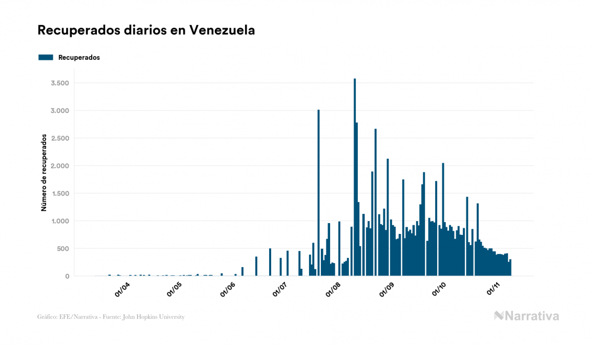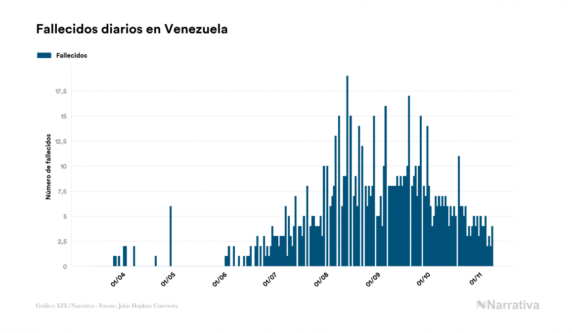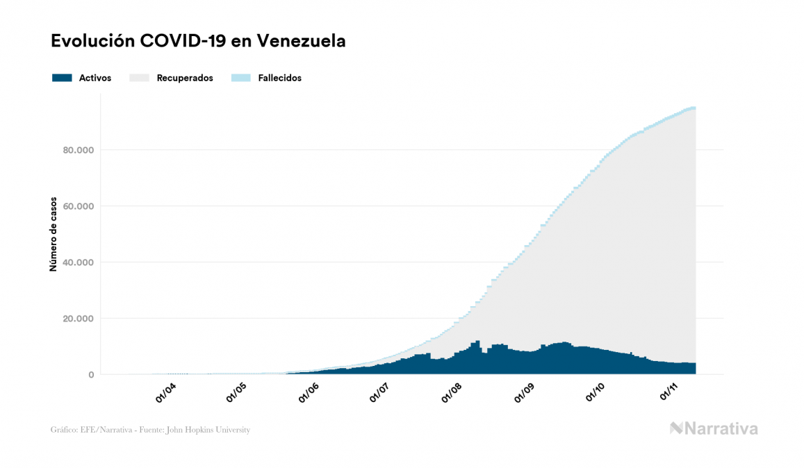El nuevo coronavirus deja ya 95.149 casos de contagio en Venezuela, con 4.265 de ellos actualmente activos y 830 fallecidos, según los últimos datos correspondientes al 10 de noviembre. Además, un total de 90.054 personas ya se ha recuperado desde que se produjo el primer contagio en el país.