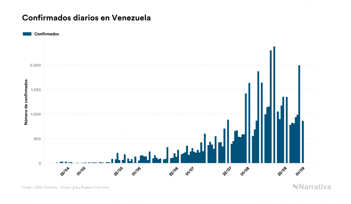 Según los últimos datos, Venezuela continúa con 8.230 casos activos de COVID-19 tras confirmarse 860 nuevos positivos y 1.021 altas médicas este martes. Desde el comienzo de la pandemia, la cifra total de contagiados asciende a 46.728, con 38.112 recuperados y 386 fallecidos.