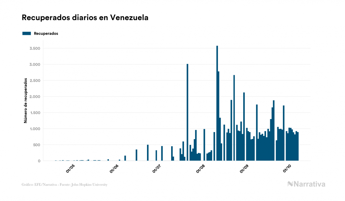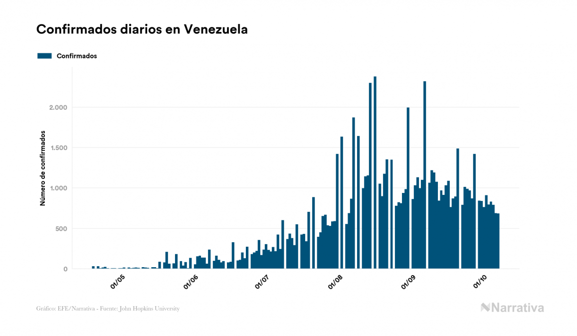 Según los últimos datos, actualmente en Venezuela hay 8.412 casos activos de COVID-19 tras confirmarse 679 nuevos positivos y 887 altas médicas este miércoles. Desde el comienzo de la pandemia, el número total de contagiados asciende a 79.796, con 70.719 recuperados y 665 fallecidos.