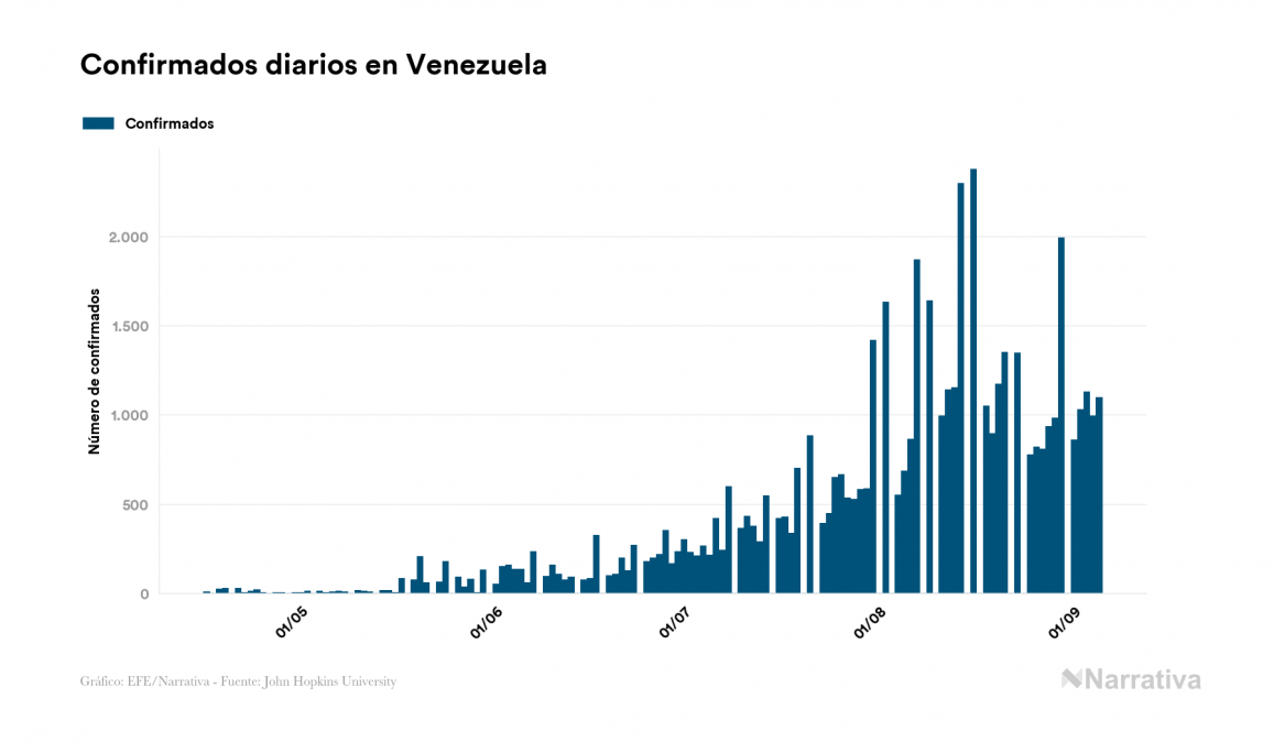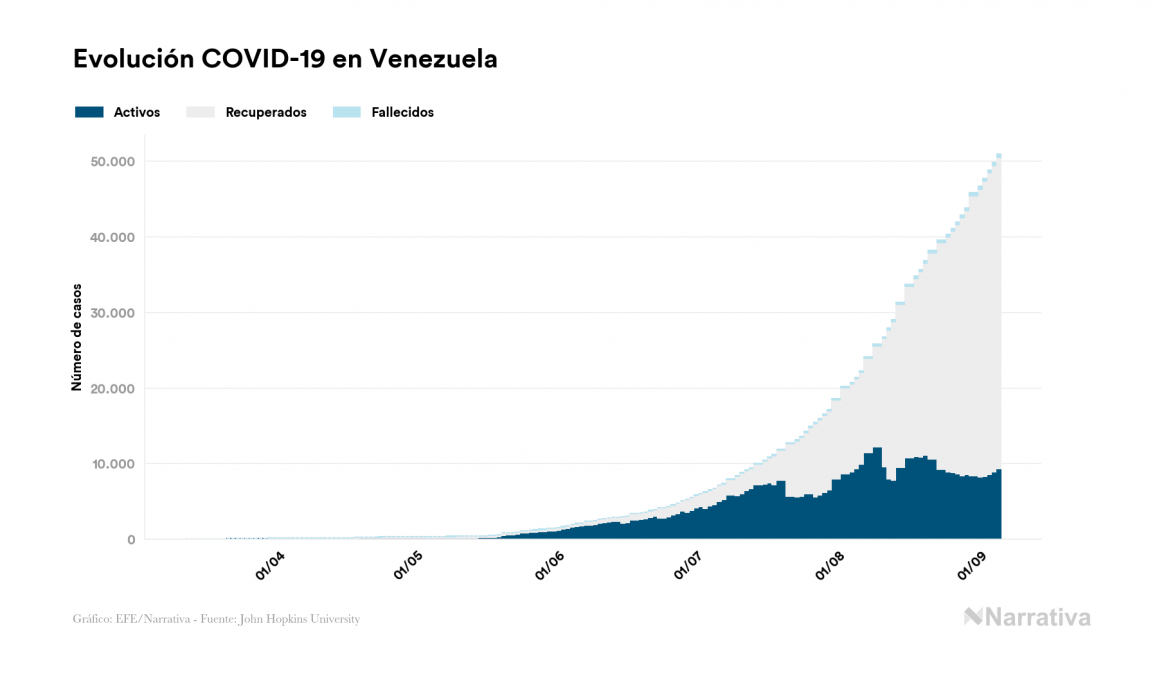 Según los últimos datos, Venezuela continúa con 9.312 casos activos de COVID-19 tras confirmarse 1.096 nuevos positivos y 675 altas médicas este sábado. Desde el comienzo de la pandemia, el número total de contagiados asciende a 50.973, con 41.249 recuperados y 412 fallecidos.