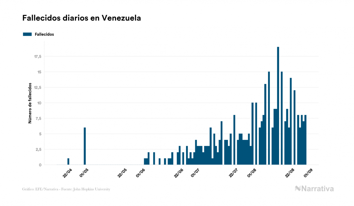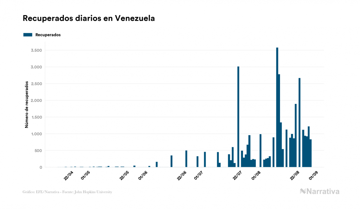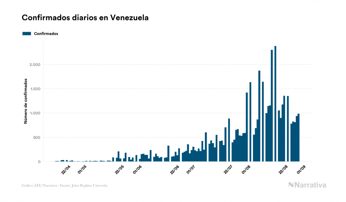 Según los últimos datos, actualmente en Venezuela hay 8.541 casos activos de COVID-19 tras confirmarse 981 nuevos positivos y 825 altas médicas este sábado. Desde el comienzo de la pandemia, el número total de contagiados asciende a 43.879, con 34.972 recuperados y 366 fallecidos.
