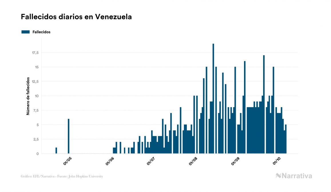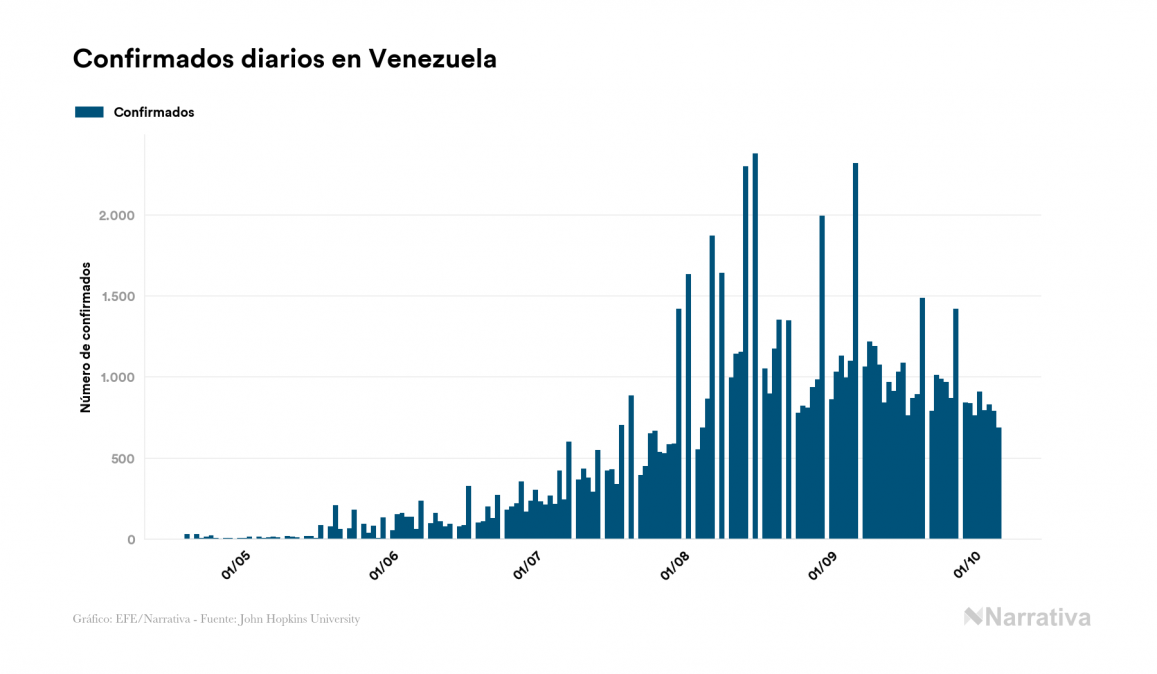 Según los últimos datos, actualmente en Venezuela hay 8.627 casos activos de COVID-19 tras confirmarse 683 nuevos positivos y 915 altas médicas este martes. Desde el comienzo de la pandemia, el número total de contagiados asciende a 79.117, con 69.832 recuperados y 658 fallecidos.