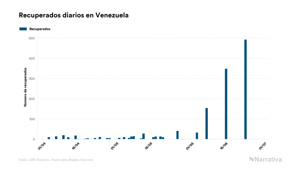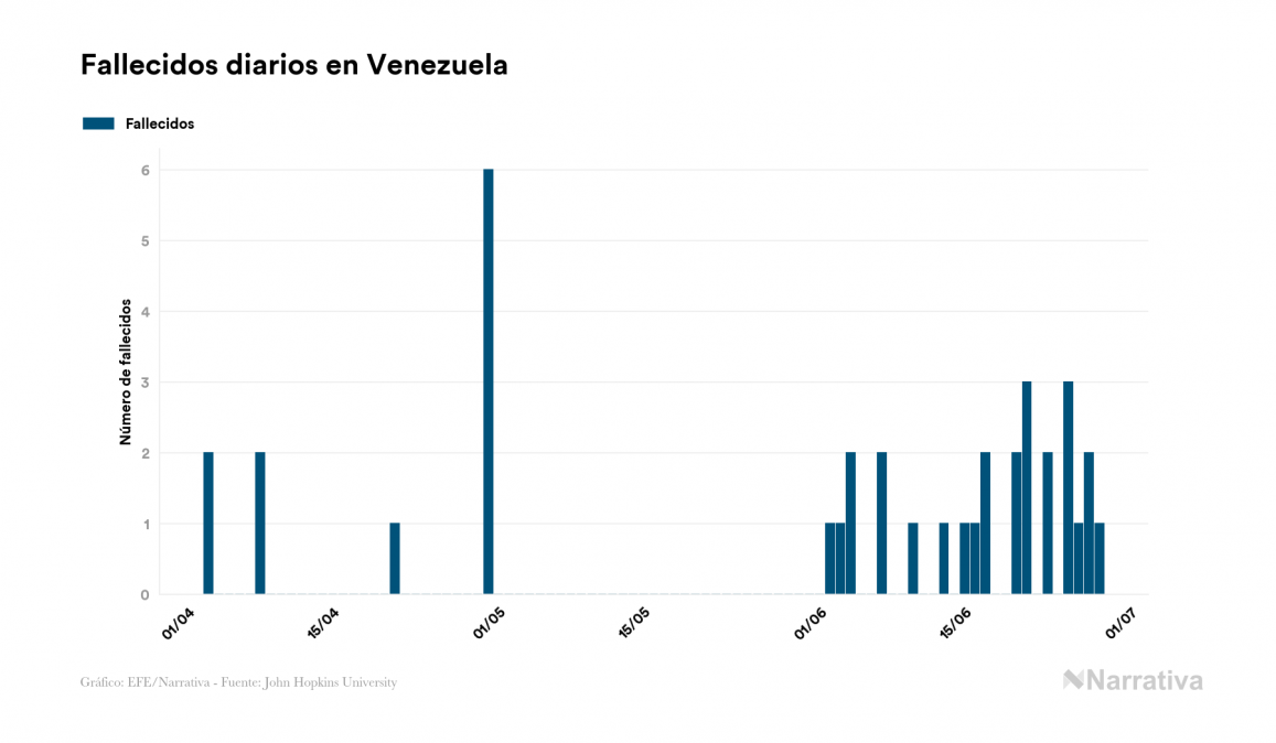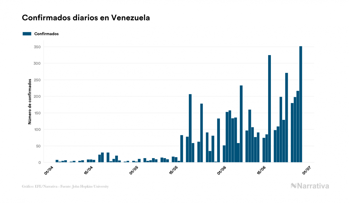 La COVID-19 deja ya 5.130 casos de contagio en Venezuela, con 3.761 de ellos actualmente activos, 42 fallecidos y 351 nuevos positivos, según los últimos datos correspondientes al 28 de junio. Además, desde el primer caso se han recuperado 1.327 personas.
